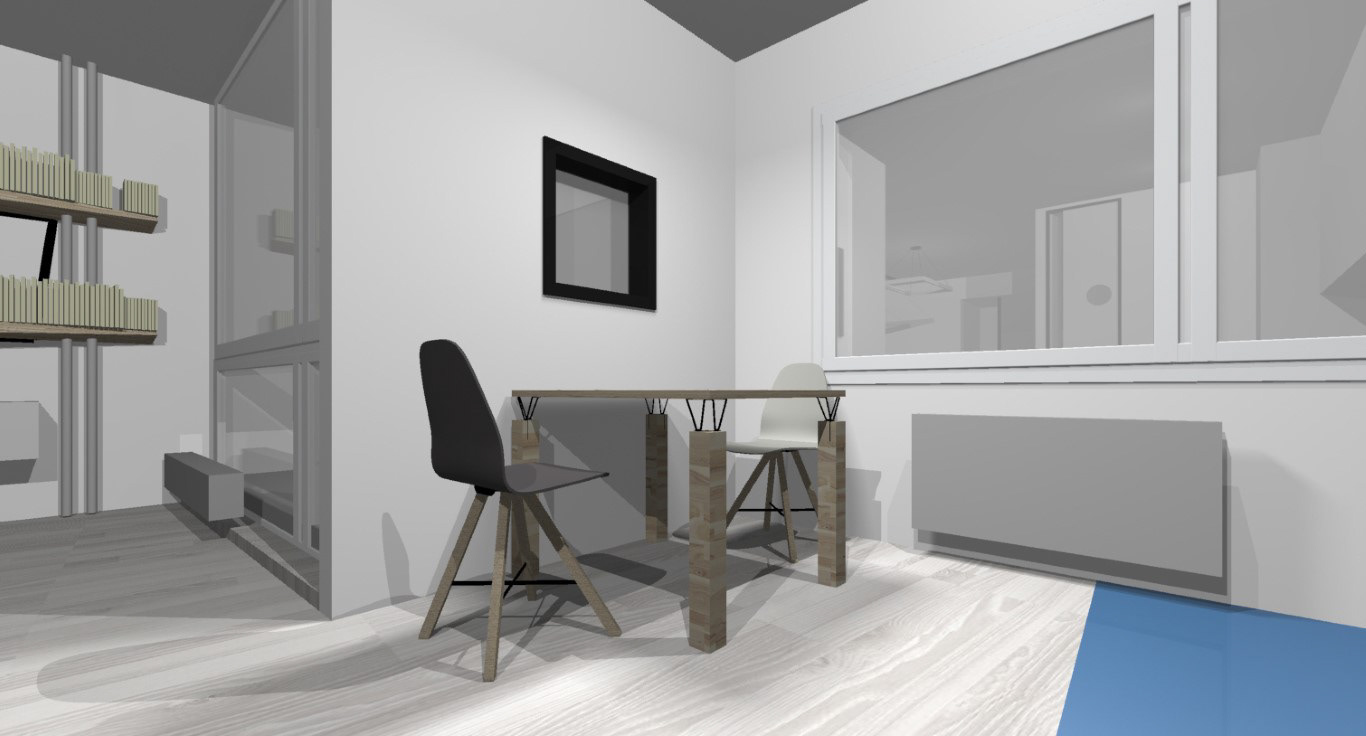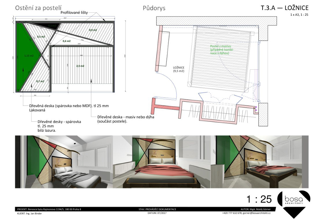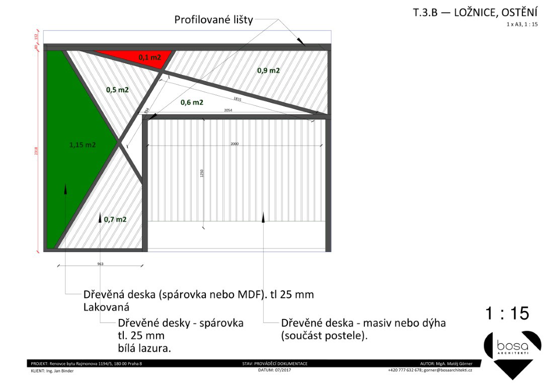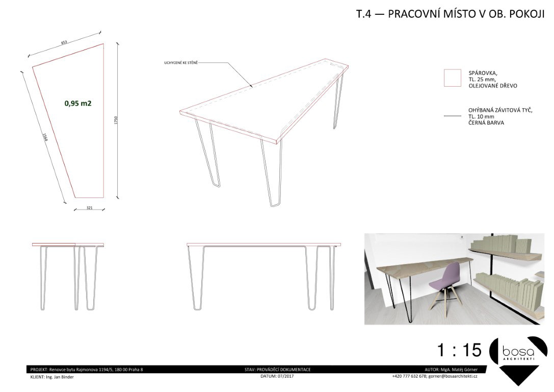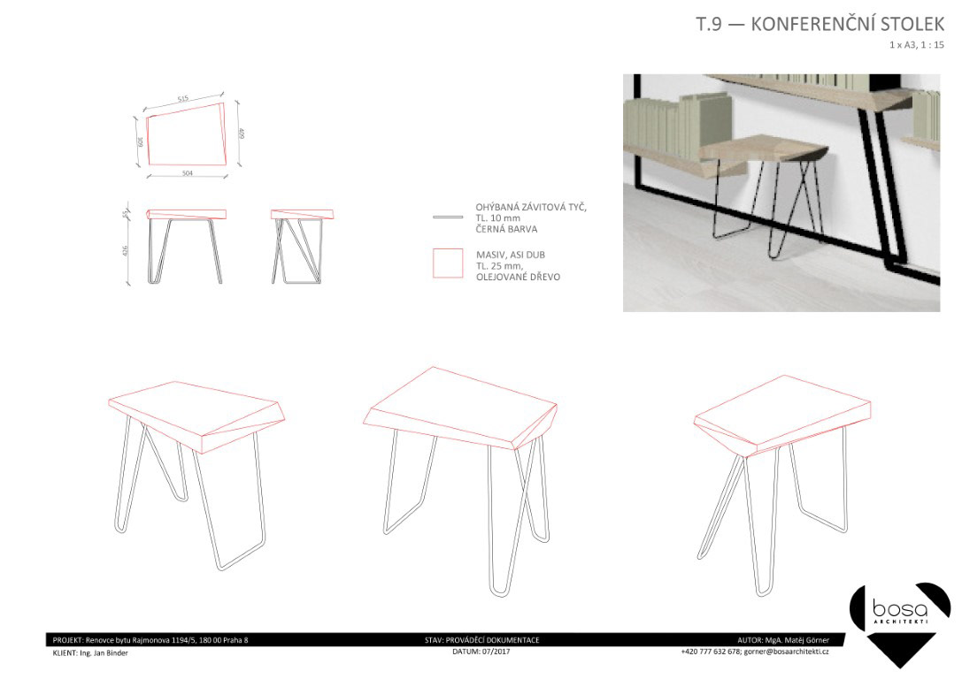 Prováděcí dokumentace pro nábytek a další vybavení bytu v Rajmonově ulici. Realizováno pouze z části.