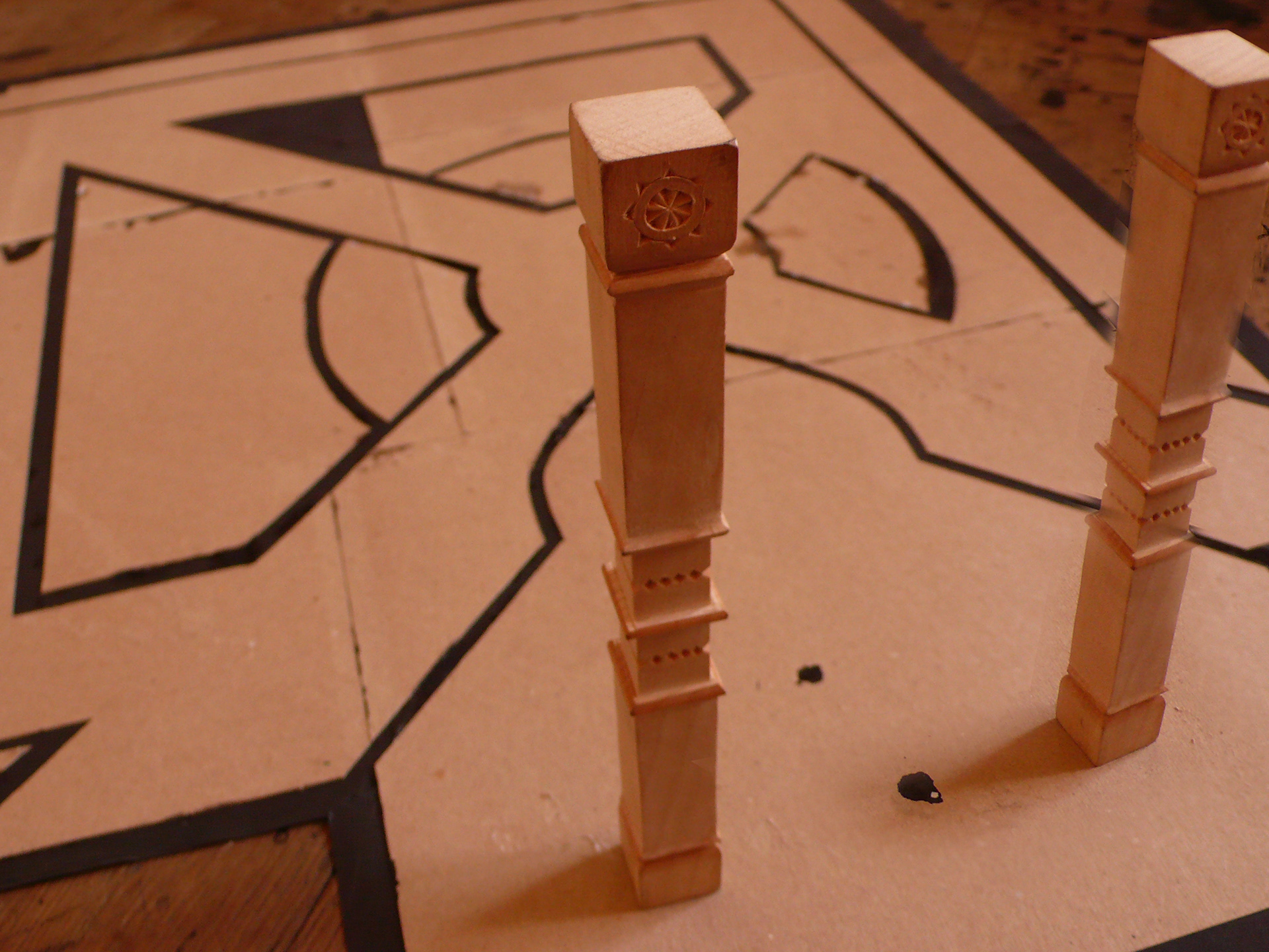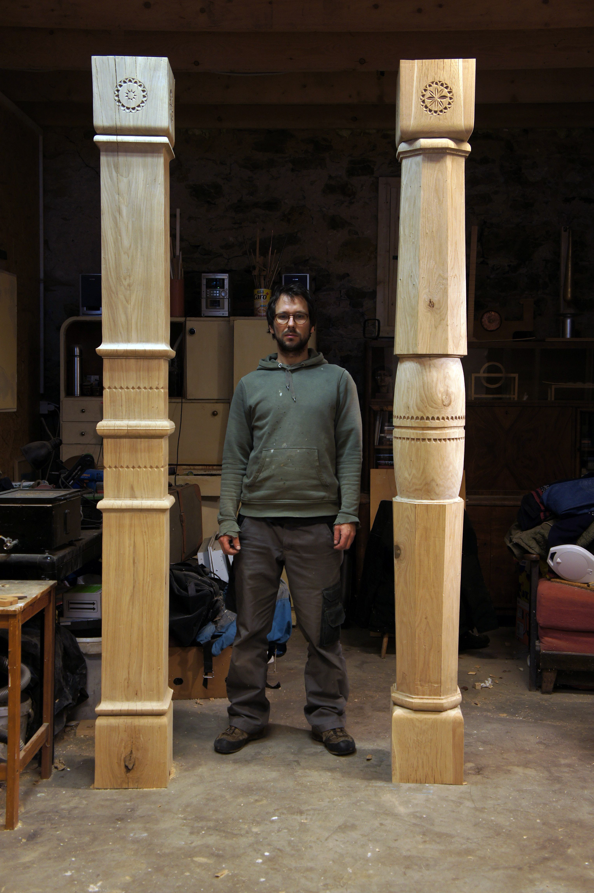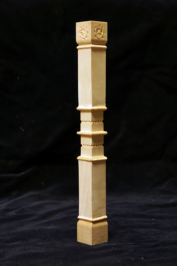 Zastavení u slovanské historie Modřan. Instalaace navazuje na širší prostorové vztahy celého komplexu. Autor sloupů (návrh + realizace): MgA. Vašek Krčál